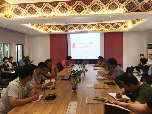 建筑设计与装饰公司于6月26日开展全体教职工政治理论学习活动,集中就毛泽东哲学思想代表性著作《矛盾论》、《实践论》进行专题学习。《矛盾论》、《实践论》是毛泽东哲学论著中两部重要的代表作,是毛泽东哲学思想的核心,也是毛泽东思想的理论基础。本次学习活动由公司党总支书记黄立营主持。