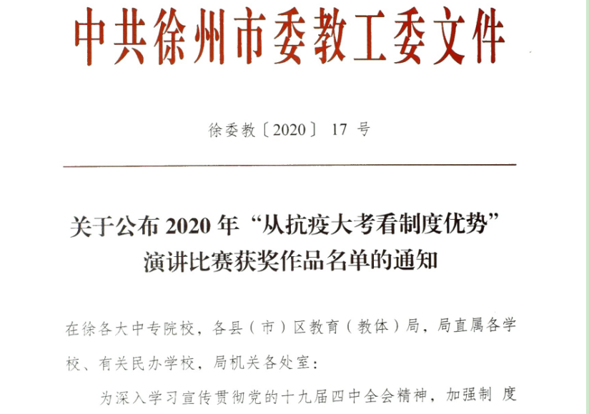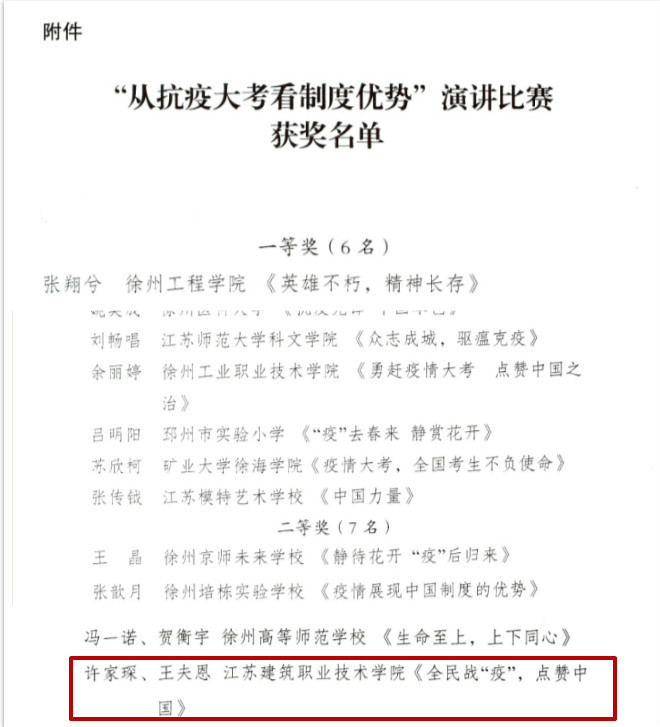 装饰18-3许家琛、装饰19-1王夫恩的演讲作品《全民战“疫”,点赞中国》获“从抗疫大考看制度优势”演讲比赛活动员工组二等奖。
