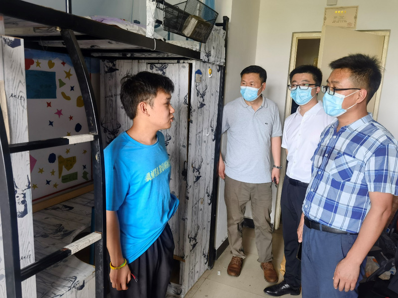 6月21日公司毕业典礼结束后,公司毕业生开始陆续离校。为确保毕业生文明离校,2022年6月22日,装饰公司党总支书记娄志刚、经理袁涛,副书记刘爱萍,副经理王子夺、王炼,公司辅导员走进毕业生宿舍,给同学们送去在校期间最后的关心和祝愿。